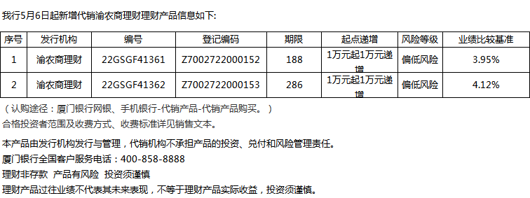 廈門銀行5月6日代銷渝農(nóng)商理財(cái)理財(cái)產(chǎn)品信息