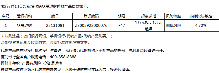 廈門(mén)銀行7月14日代銷華夏理財(cái)理財(cái)產(chǎn)品信息