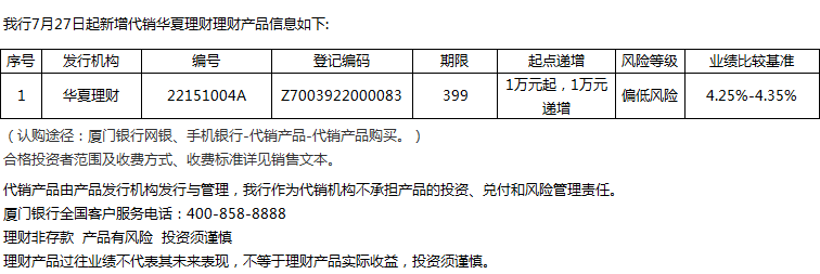 廈門銀行7月27日代銷華夏理財(cái)理財(cái)產(chǎn)品信息