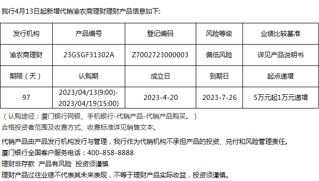廈門(mén)銀行4月13日代銷(xiāo)渝農(nóng)商理財(cái)理財(cái)產(chǎn)品信息