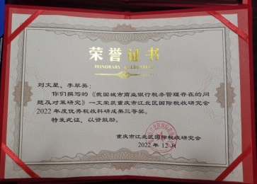 近日,重慶分行在江北區(qū)稅務(wù)學(xué)會、江北區(qū)國際稅收研究會(簡稱“稅兩會”)聯(lián)合舉辦的“2022年稅收學(xué)術(shù)年會”中,憑借撰寫報(bào)送的《我國城市商業(yè)銀行稅務(wù)管理存在的問題及對策研究》在110余篇論文中脫穎而出,榮獲本次年會三等獎。