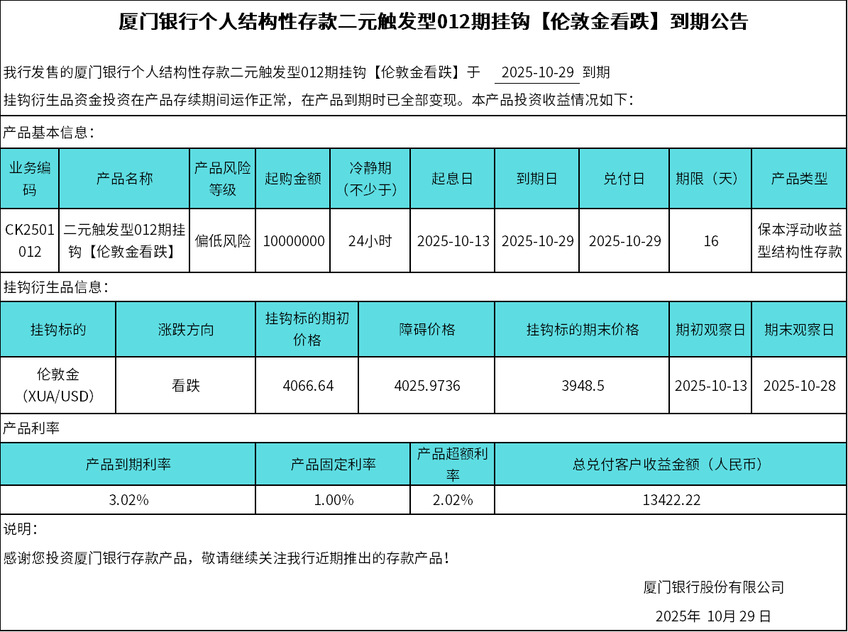 廈門銀行個人結構性存款二元觸發(fā)型012期掛鉤【倫敦金看跌】到期公告
