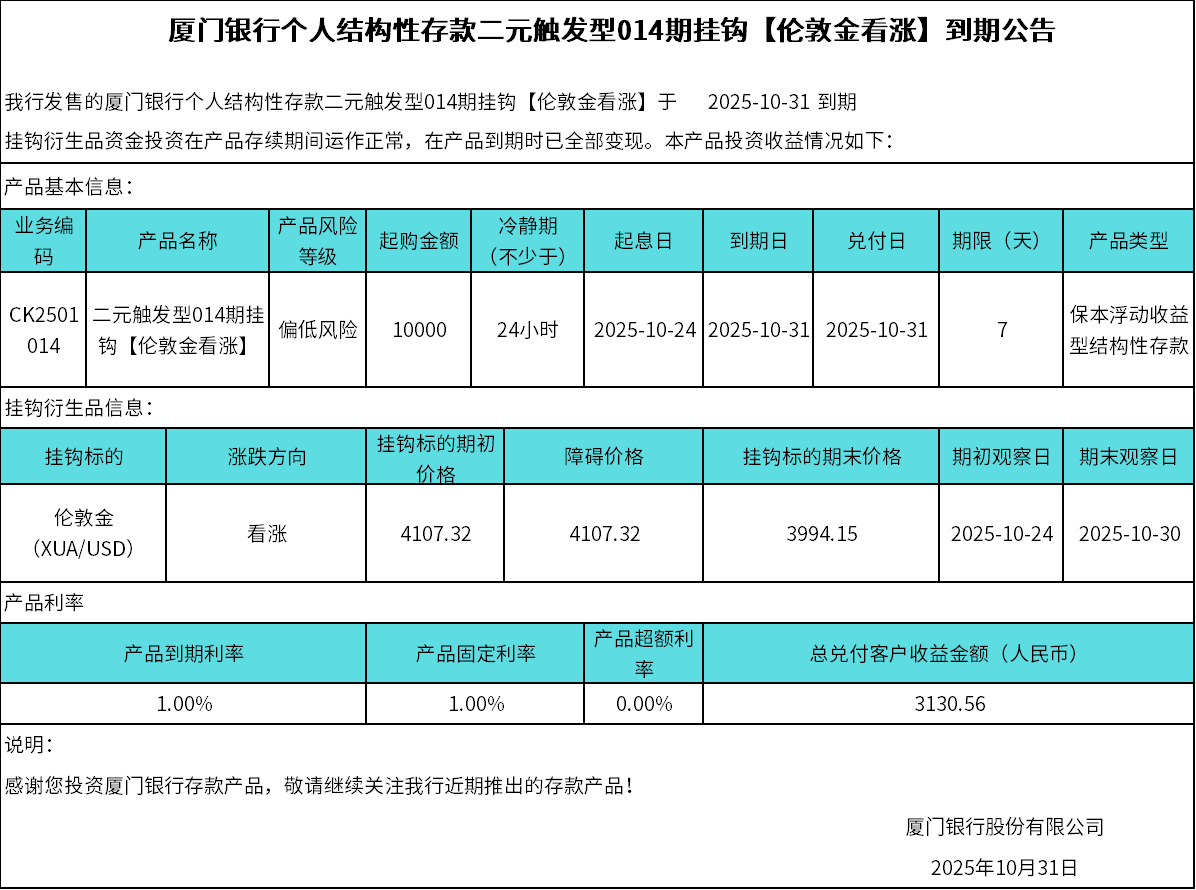 廈門銀行個(gè)人結(jié)構(gòu)性存款二元觸發(fā)型014期掛鉤【倫敦金看漲】到期公告