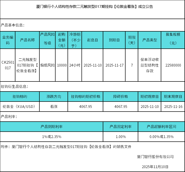 廈門銀行個人結(jié)構(gòu)性存款二元觸發(fā)型017期掛鉤【倫敦金看漲】成立公告 日期:2025-11-10 14:17:31 廈門銀行個人結(jié)構(gòu)性存款二元觸發(fā)型017期掛鉤【倫敦金看漲】銷售文件.zip 上一篇 返回 下一篇
