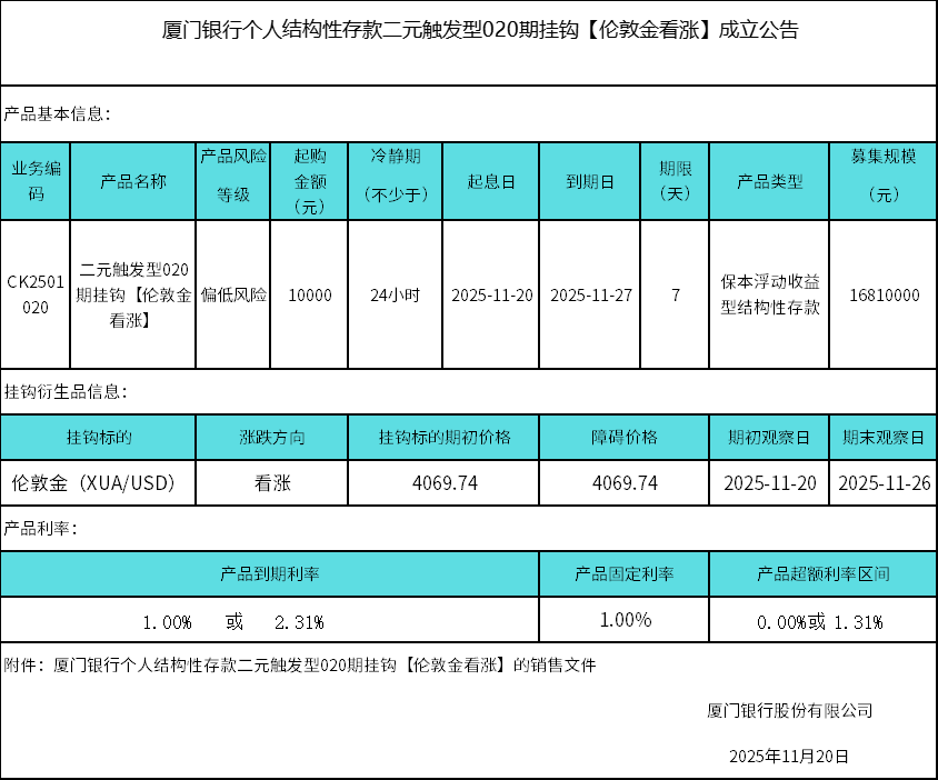 廈門銀行個(gè)人結(jié)構(gòu)性存款二元觸發(fā)型020期掛鉤【倫敦金看漲】成立公告 日期:2025-11-20 16:45:41 廈門銀行個(gè)人結(jié)構(gòu)性存款二元觸發(fā)型020期掛鉤【倫敦金看漲】銷售文件.zip 上一篇 返回 下一篇