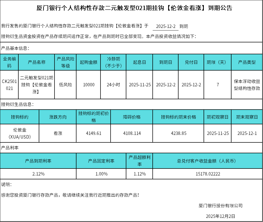 廈門銀行個人結(jié)構(gòu)性存款二元觸發(fā)型021期掛鉤【倫敦金看漲】到期公告